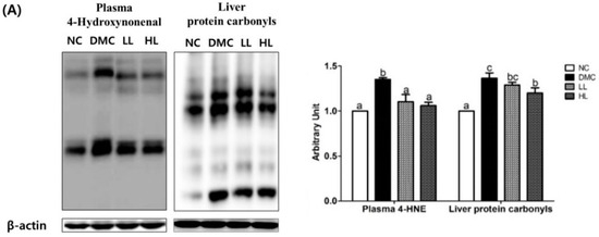 4-HNE and protein carbonyls were used as markers for oxidative stress in plasma (Figure 6A). The protein levels of plasma 4-HNE and protein carbonyls in the DMC group were significantly higher than those in the NC group. Both LL and HL groups showed significantly lower levels of 4-HNE than the DMC group. The level of protein carbonyls in the HL group was significantly lowered compared to that in the DMC group. The protein levels of nuclear Nrf2 and cytosolic CuZnSOD, MnSOD, HO-1, catalase, and NQO1 were significantly higher in the DMC group compared to those in the NC group. The protein levels of Nrf2 and catalase in the LBE supplementation groups were significantly lowered compared to those in the DMC group (Figure 6B). The protein levels of GPx were not different among the groups.