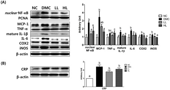 The protein levels of inflammatory response related markers were measured by Western blot in hepatic tissue (Figure 7). The protein levels of nuclear factor kappa B (NF-κB) and its related inflammatory genes including TNF-α, IL-1β, IL-6, iNOS, MCP-1, and CRP were significantly higher in the DMC group than those in the NC group. However, the levels of NF-κB, IL-1β, IL-6, and iNOS in both LBE treated groups were significantly lowered compared to those in the DMC group. Furthermore, the protein levels of COX2 and MCP-1 were lowered in the HL group compared to the DMC group. The protein levels of TNF-α and CRP were not reduced in both LBE supplementation groups.