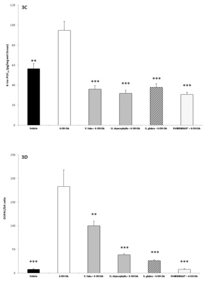 Orlando, G.; Chiavaroli, A.; Leone, S.; Brunetti, L.; Politi, M.; Menghini, L.; Recinella, L.; Ferrante, C. Inhibitory Effects Induced by Vicia faba, Uncaria rhyncophylla, and Glycyrrhiza glabra Water Extracts on Oxidative Stress Biomarkers and Dopamine Turnover in HypoE22 Cells and Isolated Rat Striatum Challenged with 6-Hydroxydopamine. Antioxidants 2019, 8, 602. https://doi.org/10.3390/antiox8120602