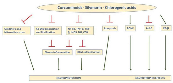 Schematic representation of the main actions responsible for the neuroprotective and neurotrophic effects of curcuminoids, silymarin, and Chlorogenic acids (CGA) in the brain. In general, the compounds inhibit oxidative and nitrosative stress, prevent formation of Aβ aggregates and fibrils, and reduce expression and activity of inflammatory agents, leading to less neuroinflammation and glial activation, decreasing apoptosis, increasing BDNF, inhibiting AChE, and binding ER-β, (T indicates inhibitory effects). TNF-a: tumor necrosis factor-a; NFkB: nuclear factor kappa light-chain enhancer of activated B cells; TNF-β, tumor necrosis factor-β; iNOS: inducible nitric oxide synthase; NO: nitric oxide; COX: cyclooxygenase; ER-β: estrogen receptor-β; BDNF: brain-derived neurotrophic factor; AChE: acetylcholinesterase.