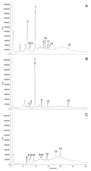 Fifteen phenolic compounds were found in bark polar extracts of the three Salix spp. in study, by UHPLC-UV-MSn (Figure 1 and Table 3), namely six flavan-3-ols (1, 2, 4–6, and 8), two acetophenones (3 and 7), a hydroxybenzoic acid (9), five flavanones (10, 11, 13–15), and a flavonol (12) (Figure 2). Regarding to flavan-3-ols, procyanidin B1 (4) and catechin (5) have been previously detected in S. viminalis L. bark [,]. In addition to procyanidin B1 (4), three other B-type procyanidin dimer isomers (2, 6, and 8) were also detected in S. viminalis L. bark. However, no B-type procyanidin dimer isomers were herein identified in S. fragilis L. bark, contrarily to what reported by Pobłocka-Olech and Krauze-Baranowska [], which may be related not only with the extraction methodology and analytical techniques, but also with the geographical origin, climatic conditions, season, plant age, and genotype-phenotype associations. Still, it is remarkable the number of B-type procyanidins besides procyanidin B1 that have already been identified in several Salix spp., namely, procyanidins B3, B6, and B7 [], which may potentiate interesting applications of this biomass in the food and health fields, due to their vast biological effects, including antioxidant.