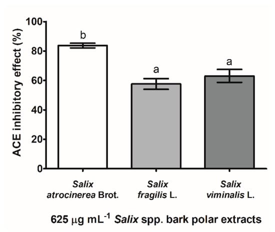 Salix spp. bark phenolic-containing extracts were investigated for their anti-hypertensive potential (Figure 3), through the inhibitory effects against ACE. Hence, all Salix spp. bark extracts at 625 µg mL−1 diminished the enzymatic activity of ACE, ranging from 58 to 84% of inhibition, with S. atrocinerea Brot. bark extracts as the most effective (p < 0.05). To the best of our knowledge, the inhibitory effect of Salix spp. bark extracts on ACE was evaluated herein for the first time. In fact, the ACE inhibitory effect has been poorly approached for polar extracts of woody plants, as assayed with 70% ethanol extracts of Populus tremula L. (Salicaceae) bark, Betula pendula Rot. (Betulaceae) buds, and Quercus robur L. (Fagaceae) bark, at 100 µg mL−1, and ranging from 11 to 28% of inhibition, respectively []. Flavan-3-ols may be strongly involved in the inhibitory effect of S. atrocinerea Brot. bark extracts, since these phenolic compounds have shown an interesting ACE inhibitory activity [,].