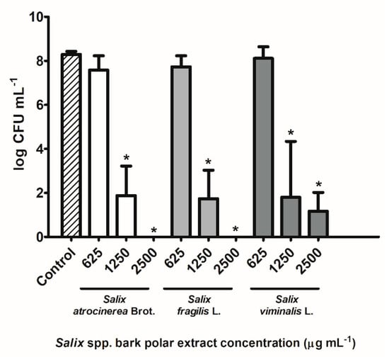 The inhibitory effect of Salix spp. bark polar extracts was also evaluated against the growth of the bacterium S. aureus ATCC® 6538 (Figure 4). Thus, the 24 h-treatments with S. atrocinerea Brot., S. fragilis L., and S. viminalis L. bark polar extracts reduced S. aureus growth, in a concentration-dependent manner (Figure 4), but statistical differences were not found at 625 µg mL−1 Salix spp. bark extracts, when compared with the control group (p > 0.05). On the other hand, Salix spp. bark extracts at 1250 and 2500 µg mL−1 significantly decreased the S. aureus growth compared to the control group (p < 0.05), with a 6–8 log CFU mL−1 range reduction, meaning that all extracts were bactericidal for this microorganism. Previous studies have demonstrated the anti-S. aureus potential of other Salix spp. bark extracts, including S. mucronate L. bark ethyl acetate (minimum inhibitory concentration (MIC) of 3125 µg mL−1) [] and S. capense extracts (5–1000 µg mL−1 MIC range) []. Phenolic compounds, like picein (3) and piceol (7), have also exhibited inhibitory effect against S. aureus growth, with MICs of 650 and 900 µg mL−1, respectively []. Synergisms between phenolic and other extracts’ constituents may have occurred, but a bioactive-guided fractionation should be conducted.