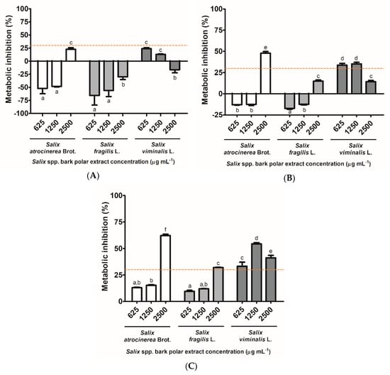 According to the international standard ISO 10993-5 for the biological evaluation of medical devices (part 5: Tests for in vitro cytotoxicity), the threshold value for a sample to be cytotoxic is a metabolic inhibition of 30%. As such, as can be seen in Figure 5A, none of the tested Salix spp. bark extracts exerted a cytotoxic effect against Caco-2 cells. In fact, some of the concentrations appeared to stimulate the mitochondrial metabolism of this cell line. For HaCaT cells (Figure 5B), none of the tested concentrations of S. fragilis L. bark extracts exhibited a cytotoxic effect against this cell line, with the S. atrocinerea Brot bark extracts at 625 and 1250 μg mL−1 demonstrating the same effect. In fact, only the highest concentration of S. atrocinerea Brot. exhibited a clear cytotoxic effect, as well as the two lower concentrations of S. viminalis L. (625 and 1250 μg mL−1) resulted in a metabolic inhibition which is close to the threshold value, therefore requiring further studies (namely, to study the production of apopototic markers), particularly as S. viminalis L. bark extract at 2500 µg mL−1 did not exert a cytotoxic effect. The mouse fibroblast L929 cells (Figure 5C) appeared to be more susceptible to the presence of the extracts than the remaining tested cell lines, with the highest concentration of S. atrocinerea Brot. and S. fragilis L. extracts, along with all concentrations of S. viminalis L. extracts, resulting in metabolic inhibitions above 30%. Overall, it is important to mark that, at 625 and 1250 μg mL−1, S. atrocinerea Brot. and S. fragilis L. extracts did not exert a cytotoxic effect against any of the tested cell lines.