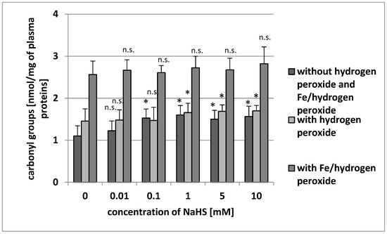 The effect of NaHS (0.01–10 mM, incubation time: 5 min) on carbonyl group formation (plasma protein oxidation) without H2O2 and Fe/H2O2, and carbonyl group formation (plasma protein oxidation) induced by H2O2 and by Fe/H2O2. Data represents the means ± SE of five experiments. *: p < 0.05 versus control, n.s.: p > 0.05 versus control.