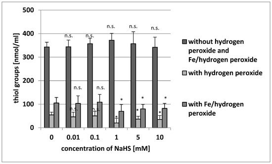The effect of NaHS (0.01–10 mM, incubation time: 5 min) on the level of thiol groups of plasma proteins (plasma protein oxidation) without H2O2 and Fe/H2O2, and the oxidation of protein thiols induced by H2O2 and by Fe/H2O2. Data represents the means ± SE of five experiments. *: p < 0.05 versus control, n.s.: p > 0.05 versus control.