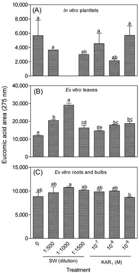 Among the in vitro regenerants, SW (1:500 and 1:1500 dilutions) and KAR1 (10−9 M) significantly enhanced the concentrations of protocatechuic and p-hydroxybenzoic acids. Likewise, in the acclimatized plants, both derivatives were significantly higher in KAR1 treatment for the leaves (10−7 M), bulbs, and roots (10−8 and 10−9 M) when compared to the control.