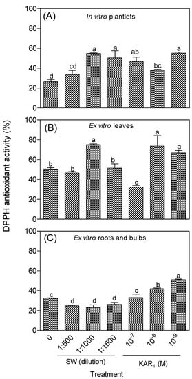 Effect of smoke-water (SW) and karrikinolide (KAR1) treatment on the free radical scavenging activity (2,2-diphenyl-1-picryhydrazyl, DPPH) of Eucomis autumnalis subspecies autumnalis (50% methanol) extract. (A): In vitro plantlet; (B): leaves; and (C): roots and bulbs of greenhouse acclimatized plants. In each graph, bar with different letter(s) are significantly different (p ≤ 0.05) based on Duncan’s Multiple Test Range (DMRT), n = 3. Value (%) for ascorbic acid (positive control) = 97.5 ± 0.03. All extracts and the positive control were evaluated at a final concentration of 0.5 mg/mL.