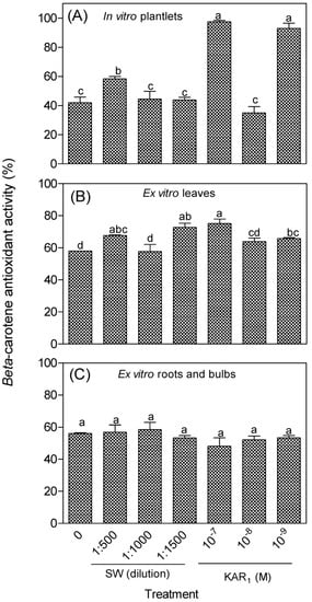 Effect of smoke-water (SW) and karrikinolide (KAR1) treatment on the antioxidant activity (β-carotene-linoleic acid model) of Eucomis autumnalis subspecies autumnalis (50% methanol) extract. (A): In vitro plantlet; (B): leaves; and (C): roots and bulbs of greenhouse acclimatized plants. In each graph, bar with different letter(s) are significantly different (p ≤ 0.05) based on Duncan’s Multiple Test Range (DMRT), n = 3. Value (%) for butylated hydroxytoluene, BHT (positive control) = 98.5 ± 0.06. All extracts and the positive control were evaluated at a final concentration of 0.5 mg/mL.