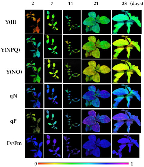 In contrast, the high values observed in the non-photochemical quenching parameters in the first steps of the acclimatisation process would indicate that part of the light captured by the chloroplasts may dissipate as heat, protecting the chloroplast against the excess of radiation and avoiding the formation of ROS, especially singlet oxygen. Different authors have previously described the increase in non-photochemical parameters as an efficient mechanism for dissipating excess light energy and thus minimizing ROS generation [13]. In addition, it has been demonstrated that NPQ and Y(NPQ) are parameters very sensitive in the early detection of stress conditions by using fluorescence images [24]. Both NPQ and Y(NPQ) are related to the energy dissipated as heat by regulated mechanism (i.e., the xanthophyll cycle) [25]. In contrast, Y(NO) reflects the fraction of energy passively dissipated as heat and fluorescence, mainly due to closed PSII reaction centres. Therefore, high values of Y(NO) are related to the inability of plants to protects itself from excess light. In that regard, after 2 days of acclimatisation, stevia plants showed the highest values of Y(NO), which progressively decreased during the acclimatisation process, reflecting a better regulation [26]. On the other hand, high values of the non-photochemical parameters indicated that plants are suffering a stress. However, as the plant adapts to the new ex vitro conditions, these parameters decreased.