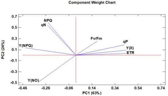 Complementarily, PCA was utilized as a mathematical tool to determine associations among the different chlorophyll fluorescence parameters, ETR, and the acclimatisation evolution (Figure 3). The first component (PC1), which explains 63% of the variability of the experiment (Table S1, Table S2 and Figure S1), indicated the greater relevance of the photosynthetic efficiency mechanisms to adapt to ex vitro conditions, as reflected by the positive values that show all the measured parameters related to the photochemical quenching parameters, such as Y(II), qP and Fv/Fm, and ETR. On the contrary, the contribution of the non-photochemical quenching parameters, related to heat dissipation in a regulated or unregulated way, was negative in the PC1. This was the case for qN, the NPQ, and Y (NPQ) in the first case (regulated dissipation), and Y (NO) in the second case (unregulated dissipation). Regarding the second component (PC2), which explained 24% of the variability of the experiment (Table S1, Table S2 and Figure S1), it indicated that in a second level of importance for the acclimatisation to ex vitro conditions the excess of light energy was also relevant, being not destined to perform photosynthesis, but dissipated safely as heat by regulated mechanisms as observed in the high positive values that show all the related measured parameters (qN, NPQ and Y(NPQ)). Again, as in PC1, any unregulated heat dissipation mechanism played a harmful role in the plant as reflected in the negative values of Y(NO).