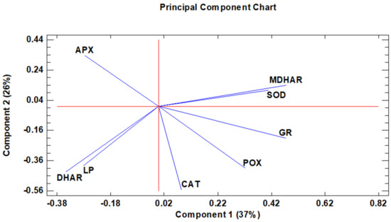 Complementarily, a PCA study was carried out to analyse the associations between the different antioxidant enzymes monitored, as well as lipid peroxidation during the evolution of acclimatisation to ex vitro conditions (Figure 7). The resulting model with two components explained 63% of the total variance. The first component (PC1), which explained 37% of the variability within the dataset (Table S3, Table S4 and Figure S2), indicates the importance of the defence mechanisms to protect from the cellular damage associated with lipid peroxidation (LP), allowing a faster acclimatisation to ex vitro conditions. The efficient antioxidant mechanisms are reflected by the positive values observed in the ROS-eliminating enzymes (SOD, POX and CAT), as well as MDHAR and GR, which guarantees redox homeostasis of the plant. However, the contribution of DHAR and APX was less important, as denoted by their negative values. With respect to the second component (PC2), explaining 26% of the variability of the experiment (Tables S3 and S4), the loadings for LP, DHAR, CAT, and POX appeared as the dominant variables, and were opposite to the positive contribution of APX. Moreover, the loadings for DHAR and LP clustered together, which may relate to the parallel evolution of both variables during the acclimatisation period.