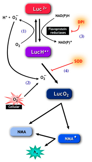 | Lucigenin | Chemiluminescence | More specific for extracellular O2•− Inability to detect O2•− at low level Low specificity for O2•− detection. Signal can be triggered by various nucleophiles and reducing agents, being sensitive to changes in the reductase activity within the tested systems. Reduced radical can generate O2•− |