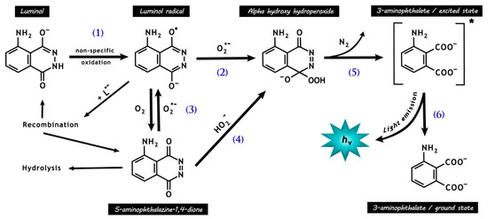 - Merényi, G.; Lind, J.; Eriksen, T.E. Luminol chemiluminescence: Chemistry, excitation, emitter. J. Biolumin. Chemilumin. 1990, 5, 53–56. [Google Scholar] [CrossRef]