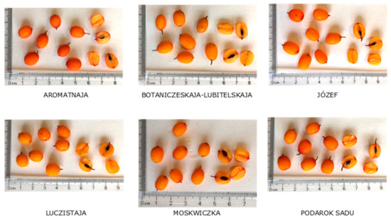 The fruits of six sea buckthorn (Hippophaë rhamnoides L.) cultivars—Aromatnaja, Botaniczeskaja-Lubitelskaja, Józef, Luczistaja, Moskwiczka, and Podarok Sadu—were tested (Figure 1). Ripe berries were collected in early July and August 2018 from the Research Institute of Horticulture in Skierniewice (Poland). Fresh fruits were used to analyze the basic chemical composition. The second portion of selected berries was frozen, freeze-dried for 24 h (Christ Alpha 1–4 LSC, Martin Christ GmbH, Osterode am Harz, Germany) and crushed by a laboratory mill (A11, IKA, Darmstadt, Germany). The homogeneous materials were stored in a freezer at −80 °C until undergoing the other analysis.