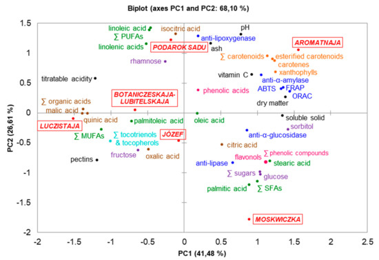 It should not be ruled out that the correlations between biological effects and lipophilic compounds may be apparent or false. The biological activities of sea buckthorn berries were tested on methanol-water solutions. Therefore, correlations for in vitro tests should be performed, with regard to lipophilic and hydrophilic compounds in H. rhamnoides. Other research on fruits also proved to be a selective correlation between chemical composition and biological activities. For example, Wang et al. [47] reported that flavonoids isolated from goji berries showed the most pronounced effect in scavenging free radicals (DPPH and ABTS) and chelating metal ions, while the zeaxanthin fraction was a strong scavenger of free hydroxyl radicals. In the studies of Wojdyło et al. [48], figs with a high content of sugars did not correlate with high anti-diabetic activity, but glycosylated derivatives of kaempferol, cyanidin, apigenin, polymeric procyanidins, and (−)-epicatechin correlated with the ability to inhibit α-amylase and α-glucosidase, and with the anti-oxidant effect (for the ORAC test). Ado et al. [49] found that a potent lipase inhibitor was kaempferol-3-O-rhamnoside isolated from C. cauliflora leaves. According to Stahl and Sies [50], carotenoids are effective anti-oxidants scavenging singlet molecular oxygen and peroxyl radicals. Principal component analysis (PCA) was conducted on the average contents of each chemical component (basic chemical composition, phenolic and carotenoid compounds, fatty acids), biological effects (anti-oxidant as ABTS, FRAP, and ORAC tests, enzyme inhibitory potential for α-amylase, α-glucosidase, lipase, and lipoxygenase), and berries of the tested H. rhamnoides cultivars. The outcomes are shown on the PCA biplot (Figure 2). The first two principal components (PC1 and PC2) explained 68.10% of the total variance (41.48% and 26.61%, respectively). The correlation biplot indicated the following: (1) Podarok Sadu berries were rich in PUFAs and had a strong anti-lipoxygenase effect, (2) anti-oxidant and anti-α-amylase activities were strongly correlated with the content of carotenoids and vitamin C, in which Aromatnaja fruits were particularly rich, (3) cv. Moskwiczka contained high concentrations of SFAs, phenolic compounds, and glucose, which, in turn, correlated with anti-lipase and anti-glucosidase activity, (4) Botaniczeskaja-Lubitelskaja, Luczistaja, and the new cv. Józef formed the most extensive berry cluster with high content of organic acids, MUFAs, tocotrienols, and tocopherols.