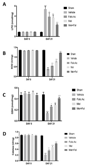 Group 4. Sham + melatonin + folic acid (Mel + Fol): Rats were injected subcutaneously with vehicle (distilled water with a final concentration of 0.5% acetic acid) instead of reserpine and treated orally with melatonin (10 mg/kg) and folic acid (3 mg/kg) for 21 days starting from 3 days after first vehicle injection.