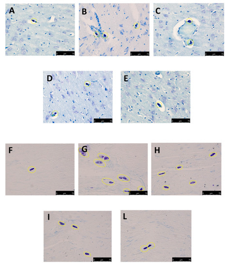 Efficacy of folic acid and melatonin administration on mast cells activation reserpine-induced. Evaluation of mast cell degranulation by toluidine blue in brain: (A) sham, (B) vehicle, (C) folic acid, (D) melatonin, (E) melatonin plus folic acid. Evaluation of mast cell degranulation by toluidine blue in sciatic nerve: (F) sham, (G) vehicle, (H) folic acid, (I) melatonin, (L) melatonin plus folic acid. 40× magnification is shown.