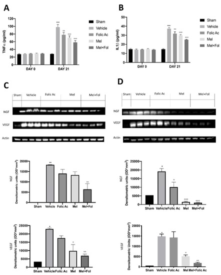 Twenty-one days after reserpine injection, IL-1β and TNF-α levels were increased in reserpine-vehicle treated rats, compared to the sham groups (Figure S5). Treatment with Mel + Fol produced a significant reduction in IL-1β (Figure 5A) and TNF-α (Figure 5B) levels in reserpine-treated rats, compared to melatonin and folic acid. Western blot analysis showed NGF and VEGF increased expression in both brain and nerve tissues harvested from reserpine-vehicle treated animals, compared to the sham groups (Figure 5C,D and Figure S5). Mel + Fol administration significantly reduced NGF and VEGF expression in reserpine-treated rats with more efficacy than melatonin and folic acid (Figure 5C,D).