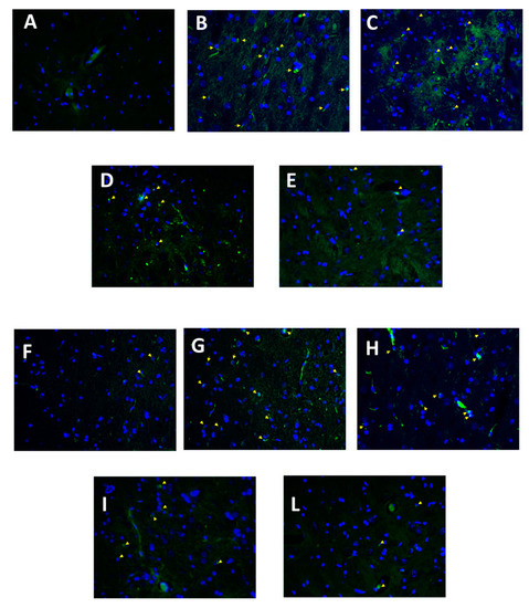 Efficacy of folic acid and melatonin administration on Iba1 and CD11b expression reserpine-induced. Immunofluorescence of brain Iba1 in (A) sham, (B) vehicle, (C) folic acid, (D) melatonin, (E) melatonin plus folic acid. Immunofluorescence of brain CD11b in (F) sham, (G) vehicle, (H) folic acid, (I) melatonin, (L) melatonin plus folic acid. 40× magnification is shown.