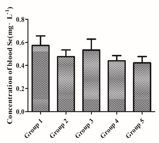 Initial two-week feeding with a Se-D diet (0.08 mg/kg Se) was sufficient to stabilize the whole-blood Se concentration between all groups. As depicted in Figure 1, no significant differences (p > 0.05) were observed in whole-blood Se concentration between all experimental groups at baseline (week 2).