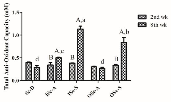 As depicted in Figure 3, TAOC values at baseline (week 2) were comparable between all the groups and showed no significant differences. By week 8, TAOC in the Se-D group showed a relative decline compared to its baseline value; however, this difference was statistically non-significant. On the contrary, TAOC values in Se-supplemented groups (ISe-S and OSe-S) were significantly higher (p < 0.05) compared to the groups fed either a Se-D diet or ISe-A and OSe-A diets (Figure 3). Moreover, TAOC values were also significantly higher (p < 0.05) in the ISe-S group compared to the OSe-S group.