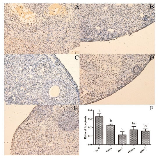 Apoptosis in ovarian tissues of aging female mice fed different concentrations of inorganic and organic selenium (Se). (A–E): Representative photomicrographs of ovarian sections showing TUNEL-positive cells in different groups. (F): Ratio of apoptosis (TUNEL-positive cells) in ovaries of aging female mice in different groups. Data are expressed as mean ± SEMs. Values with different lowercase letters (a, b, and c) indicate significant difference (p < 0.05). (A): Se-deficient (Se-D; sodium selenite 0.08 mg/kg); (B): inorganic Se-adequate (ISe-A; sodium selenite 0.15 mg/kg); (C): inorganic Se-supplemented (ISe-S; sodium selenite 0.33 mg/kg); (D): organic Se-adequate (OSe-A; Se-yeast 0.15 mg/kg); (E): organic Se-supplemented (OSe-S; Se-yeast 0.33 mg/kg) groups. Original magnification 200×. TUNEL: terminal dexynucleotidyl transferase (TdT)-mediated dUTP nick end labeling.