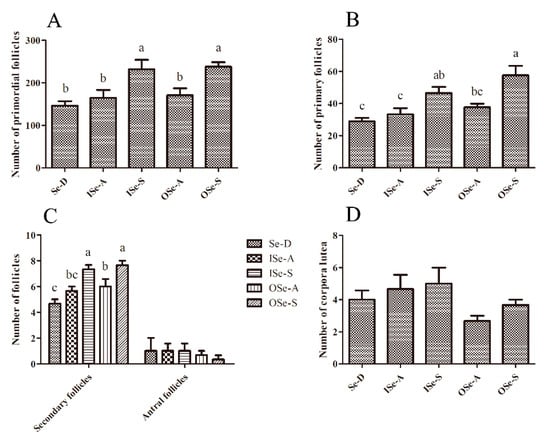 The representative photomicrographs of ovarian sections of aged female mice fed different concentrations of dietary Se are shown in Figure S2. As shown in Figure 5, our light microscopic stereological assessment of ovarian sections revealed that the numbers of primordial and primary follicles were relatively lower in the Se-D group compared to the Se-adequate (ISe-A and OSe-A; p > 0.05) and Se-supplemented (ISe-S and OSe-S; p < 0.05) groups. Although the differences in numbers of primordial and primary follicles between the Se-D and both Se adequate (ISe-A and OSe-A) groups were statistically non-significant, the latter groups showed slightly higher numbers of these follicles compared to the Se-D mice. This finding clearly shows that Se deficiency (or low levels) can contribute to an accelerated age-related depletion of primordial and primary follicles in females of an advancing age. However, as expected, significantly higher (p < 0.05) numbers of primordial and primary follicles were observed in both Se-supplemented (ISe-S and OSe-S) groups compared to the Se-D group. Meanwhile, the numbers of secondary (growing) follicles were also significantly higher (p < 0.05) in both Se-supplemented groups (ISe-S and OSe-S) compared to the Se adequate (ISe-A and OSe-A) and the Se-D groups. The numbers of antral follicles and corpora lutea showed a similar trend and no statistically significant differences were observed between all the groups (p > 0.05).