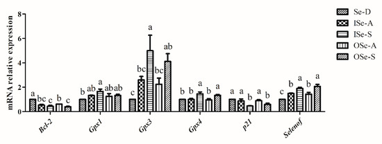 Expression of Bcl-2 was significantly lower (p < 0.05) in the Se-adequate (ISe-A and OSe-A) and Se-supplemented (ISe-S and OSe-S) groups compared to the Se-D group, in which a higher mRNA expression was observed (Figure 6). Intriguingly, the expression of p21 was also differentially regulated following feeding with different Se concentrations. It was observed that its expression was significantly downregulated (p < 0.05) in both Se-supplemented (ISe-S and OSe-S) groups compared to the Se-D group and both Se-adequate (ISe-A and OSe-A) groups (Figure 6).