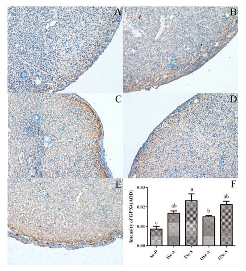 Expression of glutathione peroxidase 4 (GPX4) in ovarian tissue of aging mice fed different concentrations of inorganic and organic selenium (Se). (A–E): representative photomicrographs of ovarian sections (IHC) showing GPX4-positve signals in different groups. (A): Se-deficient (Se-D; sodium selenite 0.08 mg/kg) (B): inorganic Se-adequate (ISe-A; sodium selenite 0.15 mg/kg); (C): inorganic Se-supplemented (ISe-S; sodium selenite 0.33 mg/kg); (D): organic Se-adequate (OSe-A; Se-yeast 0.15 mg/kg); and (E): organic Se-supplemented (OSe-S; Se-yeast 0.33 mg/kg) groups. (F): Expression (pixel intensity) of GPX4 in ovarian sections of mice in different groups. AOD: average optical density. GPX4: glutathione peroxidase 4. Data are expressed as mean ± SEMs. Values with different lowercase letters (a, b, and c) indicate a significant difference (p < 0.05). Original magnification 200×.