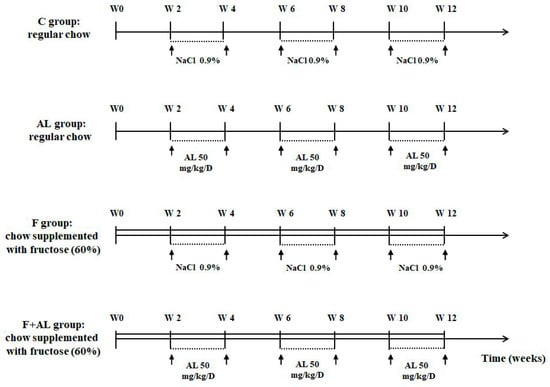 - Fructose-fed group treated with alpha-lipoic acid (F + AL, n = 12) received chow supplemented with fructose (60%) and the rats were injected with the same dose of alpha-lipoic acid at the same intervals of times as the previous group (AL group).