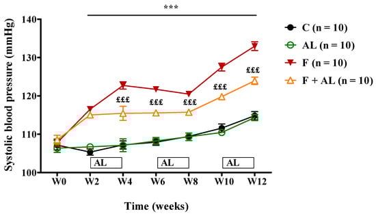 Evolution of the systolic blood pressure (SBP), assessed over the 12 weeks of the study in the control group (C), the alpha-lipoic acid-treated group (AL), the fructose-fed group (F), and the fructose-fed group treated with alpha-lipoic acid (F + AL) (*** p < 0.001: F and F + AL vs. C and AL; £££ p < 0.001: F + AL vs. F).