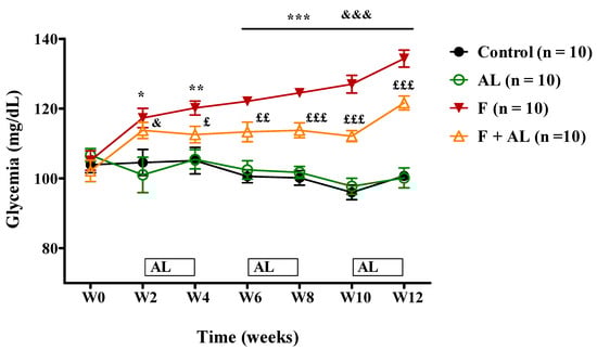 Evolution of the glycemia, assessed over the 12 weeks of the study in the Control group (C), the alpha-lipoic acid-treated group (AL), the fructose-fed group (F), and the fructose-fed group treated with alpha-lipoic acid (F + AL) (* p < 0.05, ** p < 0.01, *** p < 0.001: F vs. C and AL; & p < 0.05, &&& p < 0.001: F + AL vs. C and AL; £ p < 0.05, ££ p < 0.01, £££ p < 0.001: F + AL vs F).