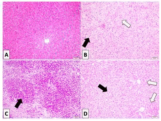 Histological features of the liver in the experimental groups: (A) Control group—a normal histological aspect of the liver, H&E stain. (B) Fructose group—diffuse degenerative changes represented by a vacuolated aspect of the hepatocytes (black arrow) with karyopyknosis and nuclear fading (blank arrow), H&E stain. (C) Fructose group—intrahepatocytic vacuoles display a PAS-positive material suggesting glycogen accumulation (black arrow), PAS stain. (D) Fructose-fed group treated with alpha-lipoic acid (F + AL group)—perilobular location of the multivacuolated hepatocytes (black arrow), with no significant changes of the hepatocytes from the centrilobular and mediolobular zones (blank arrows).