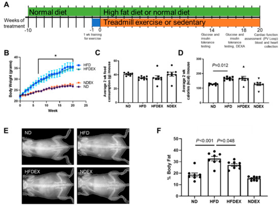 Ten-week-old male C57BL/6J mice (The Jackson Laboratory, Bar Harbor, Maine, USA) were randomly separated into four treatment groups: (1) normal diet (ND), (2) ND mice performing exercise training (NDEX), (3) HFD, and (4) HFD performing EX (HFDEX). The normal diet contained 17% kcal from fat and 3.1 kcal/g total (Teklad Diet 7012, Envigo, Hackensack, NJ, USA). The HFD contained 45% kcal from fat and 4.7 kcal/g total (Teklad Diet 08811, Envigo, Hackensack, NJ, USA). Mice were treated with the different diets and exercise regimens for 20 weeks (Figure 1A).