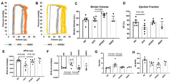 Systolic and diastolic function of the left ventricle was measured using PV loop recordings after 20 weeks of diet and exercise regimens (Figure 3). HFD-induced obesity led to an impairment of diastolic function when compared to ND-fed mice. The change in left ventricular pressure over time (dP/dtmin), a measure of relaxation, was elevated in HFD mice when compared to ND mice (Figure 3F), delineating a lower rate of relaxation. The exponential decay of the ventricular pressure during isovolumic relaxation (Tau) was lengthened in obese mice (Figure 3G), also indicating impaired diastolic function. dP/dtmax, a measure of systolic contractility, decreased with HFD. Ejection fraction was unchanged in all groups, suggesting that cardiac dysfunction had not yet manifested into systolic heart failure. Heart rate during hemodynamics measurement was unchanged between groups (Figure 3H).