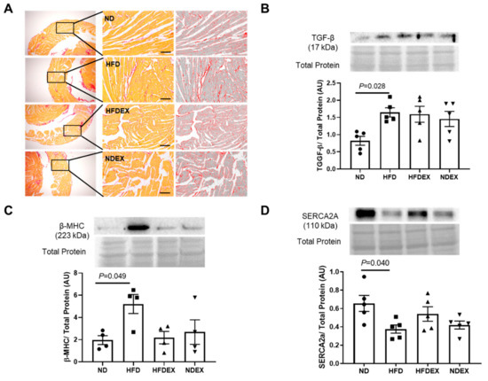 High- fat diet upregulates markers of cardiac structural remodeling. (A) Representative sirius red staining of a section of the left ventricle for interstitial collagen fibers was unaltered in all the four groups. Scale bar = 200 µm. A similar portion of the left ventricular wall was imaged in all groups. (B) Western blot quantification of the pro-fibrotic signaling marker TGF-β protein expression in left ventricle tissue demonstrates an upregulation in HFD mice compared to ND. (C) Western blot quantification of the hypertrophy marker β-MHC protein expression in left ventricle tissue demonstrates an upregulation in HFD mice compared to ND. (D) Western blot quantification of contractile protein sarco/endoplasmic reticulum Ca2+-ATPase (SERCA-2A) protein expression in left ventricle tissue demonstrates a downregulation in HFD mice compared to ND. All values are expressed as mean ± SEM with dots of different shape representing each animal in a group. One-way ANOVA and Tukey’s post-hoc test were used for statistical analysis.