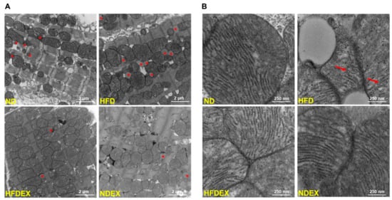 Exercise training prevents high- fat diet- induced metabolic remodeling. (A) Representative electron micrographs in a section of left ventricle tissue. * shows a lipid droplet which were increased in quantity and size in the HFD heart section but reduced with exercise training. (B) Higher magnification focusing on mitochondria in the left ventricle. Mitochondrial cristae structure is deformed in HFD compared to ND, as indicated by arrows. N = 2/group.