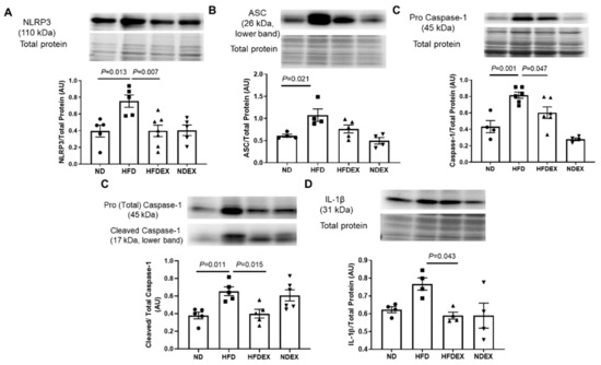 Pyroptosis precedes cardiac remodeling and dysfunction and is induced by lipotoxicity and mitochondrial damage. In the left ventricle of the four groups of mice, we evaluated the following components of pyroptosis: inflammasome formation (NLRP3), caspase activation (caspase-1 cleavage), and elevation of inflammatory cytokine IL-1β, which is activated by caspase-1 during pyroptosis. Inflammasome formation and activation were observed in the HFD group by elevation in protein expression of NLRP3 and apoptosis-associated speck adaptor protein (ASC) (Figure 6A,B). Expression of pro-caspase-1 and the ratio of activated caspase-1 to total caspase-1 were also elevated in obese mice (Figure 6C), indicating the activation of pyroptosis. Finally, a pro-inflammatory response in the heart due to pyroptosis was observed by an increase in the expression of IL-1β (Figure 6D). Exercise training prevented HFD-induced upregulation of NLRP3, ASC pro-caspase-1 and IL-1β, and activation of caspase-1 (Figure 6A–D). These results demonstrate that obesity-induced cardiac inflammasome formation, pyroptosis activation, and pro-inflammatory response, all of which were prevented by an exercise training regimen.