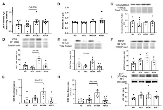 Exercise training increases biosynthesis of hydrogen sulfide in the heart of obese mice. Exercise training increased the concentration of H₂S in mice fed with both a normal and high-fat diet in the left ventricle tissue of the heart (A) but not in plasma (B). Homocysteine, the precursor substrate for H₂S production, was unaltered among the four groups (C). Protein expression of the H₂S-producing transulfuration enzyme CBS was increased in the left ventricle of HFDEX mice compared to HFD mice (D). Protein expression of another H₂S-producing transulfuration enzyme, CSE, was also increased in the left ventricle of HFDEX mice compared to HFD mice (E). The final H₂S-producing enzyme, MPST, localized in mitochondria was unchanged between groups (F). Transcriptional activation of H2S-producing enzymes, CBS and CSE, was observed with increased mRNA expression in HFDEX (G, H), however activation of the transcriptional factor SP1 that activates CSE was unchanged (I). All values are expressed as mean ± SEM with dots of different shape representing each animal in a group. One-way ANOVA and Tukey’s post-hoc test were used for statistical analysis.