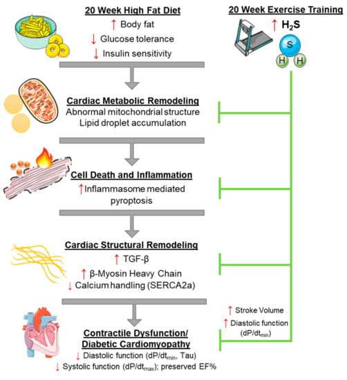 In this study, we demonstrated that a 20-week high-fat diet treatment to C57BL6 mice led to obesity and a T2DM phenotype with insulin resistance. This diet treatment induced systolic and diastolic dysfunction of the left ventricle while maintaining ejection fraction, similar to the heart failure with preserved ejection fraction condition. Further analysis demonstrated that cardiac dysfunction was due in part to pro-fibrotic and hypertrophic signaling, damaged mitochondrial structure, lipid droplet accumulation, and an increase in pyroptosis. Importantly, a moderate intensity EX training regimen prevented cardiac dysfunction, metabolic remodeling, and pyroptosis activation. An increase in H₂S synthesis in the myocardium may explain the cardioprotection of EX in the heart. These findings are summarized in Figure 8.