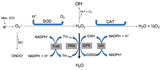 Free radical generation. Free radicals formed by the electron transport chain are immediately removed and converted to water through a series of enzymatic reactions. ETC: electron transport chain; SOD: superoxide dismutase; CAT: catalase; GPX: glutathione peroxidase; GR: glutathione reductase; PRX: peroxiredoxins; GSH: glutathione; GSSG: glutathione disulfide; Trx: thioredoxin; O2•−: superoxide; NO•: nitric oxide; ONOO−: peroxynitrite; H2O2−: hydrogen peroxide.