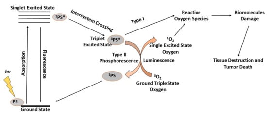 During photodynamic therapy (PDT), generated reactive oxygen species (ROS) kill the targeted tumor cells. PDT depends on the successful accumulation of photosensitizers (PSs) in tumor cells to initiate the process of irradiation of targeted areas for activation of the PSs. When irradiated with light of a specific wavelength, a photochemical reaction leads to the production of ROS in the presence of oxygen. When the PS absorbs the photon energy it is excited and jumps from the ground state to the excited singlet state and the energy is emitted back as fluorescence or heat via internal conversion. Should intersystem-crossing occur, the PS is converted to an excited triplet state, which can transfer electrons with cellular biomolecules, ultimately leading to the generation of ROS in a Type I reaction. Alternatively, the excited triplet state PS transfers its electrons to ground triplet state molecular oxygen (3O2), leading to the generation of an excited singlet oxygen (1O2) in a Type II reaction.