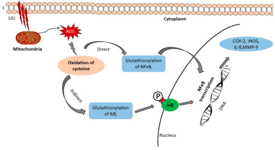Mechanism of photobiomodulation (PBM). When low-powered light (LILI) enters the cell, it is immediately absorbed by cytochrome c oxidase, which is present in mitochondria. This results in an increased respiratory chain reaction and the overall redox reaction is altered. The increase in reactive oxygen species (ROS) stimulates the oxidation of cysteine molecules. The glutathionylation of IkB and S-glutathionylation of p50 activates NF-kB and transcription of specific genes. This further stimulates the activation of the IkB kinase complex, leading to phosphorylation, ubiquitination, and degradation of IkB proteins. Released NF-kB dimers then translocate into the nucleus, bind to specific DNA sequences, and promote the transcription of target genes such as interleukin (IL)-2, IL-6, IL-8, inducible nitric oxide synthase (iNOS), COX-2, and matrix metallopeptidases (MMP)-9.