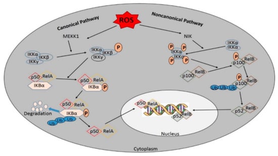 Hydrogen peroxide inhibits IKK activation by directly affecting IKKβ through its cysteine inhibitory ability in catalytic domains of tyrosine phosphatases. The interactions of ROS with cysteine residues are essential in order to affect the NF-кB pathways [74,75]. They facilitate the phosphorylation of serine residues in the activation loops of IKK in cells [75], and IKK triggers the ubiquitination and degradation of IkBα, which is usually phosphorylated on serine 32 and 36 [76]. The kinase upstream of IKK or mitogen-activated protein kinase 1 (MEKK1) is inactive when glutathionylated at C1238. ROS also target IKK and affect the NF-кB pathway, S-glutathionylation and IKKB functions via phosphorylation and degradation of IкBα on tyrosine residues and activation of the NF-кB pathway, as this may inhibit IкBα phosphorylation. They have the potential to influence the ubiquitination and degradation of IkB and activate NF-кB by inactivating Ubcl2 [77]. In the non-canonical route, NF-кB-inducing kinases (NIK), i.e., the upstream kinases, are activated by ROS through inhibition of phosphatase and oxidation of cysteine residues [78].