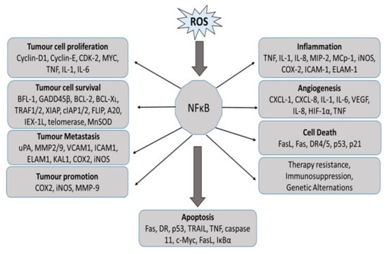 Moreover, ROS appear as vital bridging factors that mediate the crosstalk between JNK and NF-кB signaling pathways and interconnect ROS-mediated NF-кB and cell death, with the ability to inhibit JNK activation [79]. Furthermore, NF-кB downregulates JNK activation by suppressing TNFα-induced ROS accumulation. Due to their exerted oxidative stress, ROS directly participate in upregulation or downregulation of NF-кB through their interactions with cytoplasmic components. ROS are noxious at certain cellular levels and their inhibition results in the blockage of TNFα-induced programmed cell death facilitated by the NF-кB signaling pathway [80]. However, nuclear ROS might solely lead to a reduction of the binding ability of NF-кB to DNA [81]. The respective ROS accumulation and resulting oxidative stress generated in a specific subcellular localization becomes significant, as oxidative damage could be avoided and cell survival could be maintained [82]. Cell survival is the most probable outcome of the increased expression of NF-кB target genes, and only in a few exceptional cases does a cell death response prevail. Therefore, it is expected that, on one hand, ROS would modulate NF-кB responses, and on the other hand, NF-кB target genes would promote survival by ROS attenuation [83].