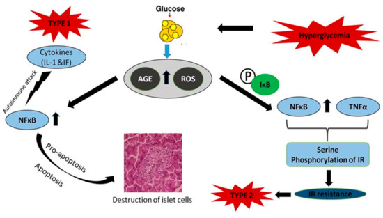Insulin-dependent (type 1) and insulin-independent (type 2) diabetes are the two major variations of diabetes seen among humans. In type 1 diabetes, beta pancreatic cells are prone to autoimmune attack by cytokines, such as interferon and IL-1, and NF-кB is mostly inactive in resting cells. However, IL-1 can activate the translocation of NF-кB to the nucleus [91]. NF-кB regulates the expression of cytokine-induced genes, which play very significant roles in pro- or anti-apoptotic cascades (Figure 6). Cytokine-induced NF-кB activation can be reverted by a non-degradable mutant form of inhibitory кB (IкB) (S32A, S36A) in recombinant adenovirus (AdIB (SA) 2) in human pancreatic islet cells or by transfection with a stable inhibitor of NF-кB in purified rat cells [92,93]. Moreover, intravenous administration of a “dummy” NF-кB and mice deficient in NF-кB (p50) showed resistance to alloxan- and streptozotocin-induced islet cell death [94]. This could be considered a strategy to protect cytokine-induced in vitro and in vivo apoptosis, whereby inhibition of NF-кB is achieved. This highlighted the pro-apoptotic effect of NF-кB activation in β-cells of the pancreas. Blocking NF-кB for a prolonged period displayed impaired development of endocrine cells and expression of important genes involved in the insulin-secretion pathway [95]. Interestingly, resistance to NF-кB activation could decrease the time course of the development of diabetes. Hence, it is more important to consider the mechanisms that regulate NF-кB in cells and genes in diabetic conditions before building up inhibition strategies.