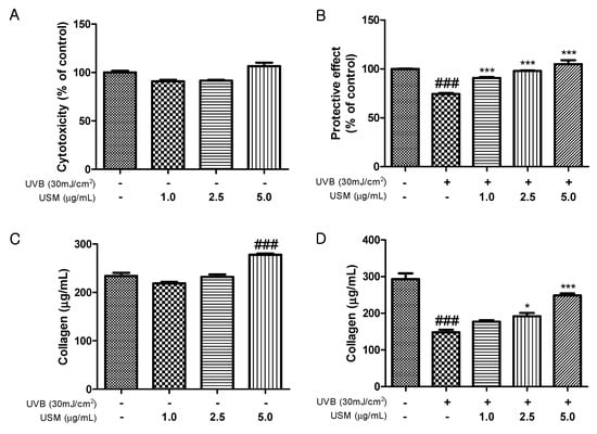 UVB irradiation stimulates collagenase activity and increases wrinkle formation through the breakdown of collagen in the dermal [24,25]. We investigated the protective effects of USM against UVB-induced damage in Hs68 cells. The viability of Hs68 cells was not significantly altered by 48 h of incubation with USM up to 5 µg/mL (Figure 1A). Exposure to UVB reduced cell viability by 26% compared to control cells. However, USM treatment decreased this UVB-induced cytotoxicity (Figure 1B). We also assessed total collagen production in response to USM treatment and found that, at 5.0 µg/mL, USM increased total collagen production by 18.9% compared to that in control cells (Figure 1C). Although UVB irradiation decreased total collagen production (Figure 1D), USM treatment significantly mitigated UVB-induced collagen degradation.
