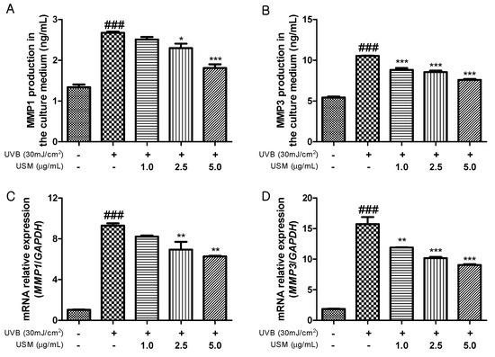 MMPs play a crucial role in the mechanism of skin photoaging induced by UVB exposure [32]. UVB irradiation activates MMP1 that breaks down collagen [33]. MMP3 activates other MMPs such as MMP1, MMP7, and MMP9. Therefore, an MMP inhibitor may be effective at preventing UVB-induced skin sagging and wrinkling. We investigated the effect of USM treatment on MMPs in Hs68 cells. UVB irradiation significantly increased the production of MMPs compared to non-irradiated Hs68 cells (Figure 3A,B). However, USM treatment markedly decreased MMP1 and MMP3 production in a dose-dependent manner. The results also showed that MMP mRNA levels were also reduced in response to USM treatment (Figure 3C,D). Together, our results suggest that USM exerts an important role in protecting the skin from photoaging.