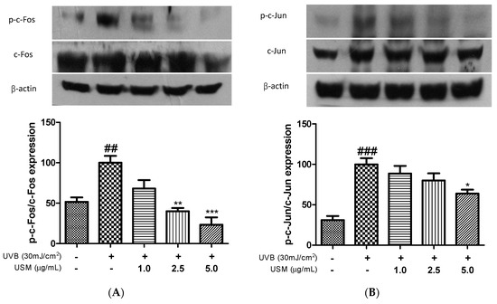 The AP-1 transcription factor, which is involved in MMP expression, is reportedly regulated by MAPKs [34]. A previous study showed that UVB irradiation increased the mRNA expression levels of c-Jun and c-Fos [32]. Park et al. reported that a Eucalyptus globulus extract markedly decreased the levels of UVB-induced phosphorylated c-Jun and c-Fos [35]. We confirmed that exposure to UVB irradiation led to the activation of AP-1. However, USM treatment suppressed c-Fos phosphorylation by 31.9, 59.9, and 76.7% at the concentration of 1.0, 2.5, and 5.0 µg/mL, respectively, compared to UVB irradiation alone (Figure 4A). We also assessed the expression level of c-Jun. Treatment with USM dose-dependently inhibited c-Jun phosphorylation by 11.4%, 20.0%, and 36.2%, respectively (Figure 4B). These results indicate that USM can directly suppress collagen degradation in human skin fibroblasts.